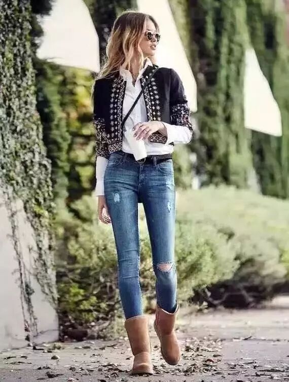 雪地靴因为本身就比较笨重,所以千万别选择五颜六色、很复杂的款式或者亮片、流苏很多的,会加重视觉负担哦。