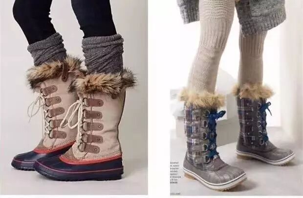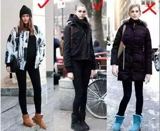 因为和传统的靴子不一样,雪地靴的版型是比较宽松的,及膝的雪地靴可是会让你看起来 很胖哟!所以,谨慎尝试哈!比如下图可以看到同样的人,不同高度的雪地靴模样