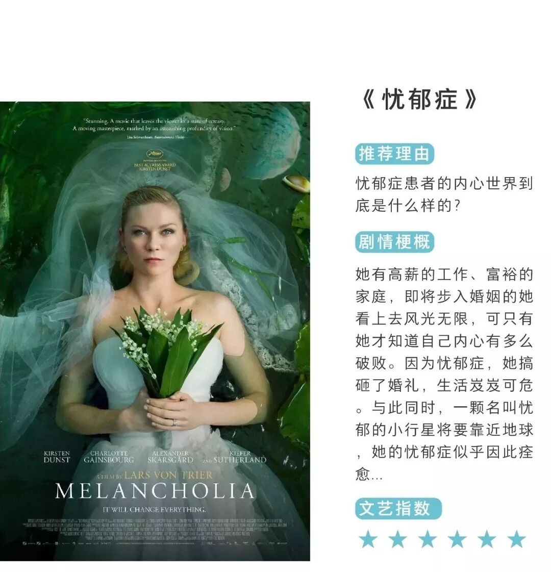 这部电影来自我最喜欢的导演拉斯·冯·提尔!要说这部文艺片有多美,那就是每一幕都能截图当壁纸!但它没有流于形式,而是用极其细腻的镜头和情节反映出了忧郁症患者内心的世界。