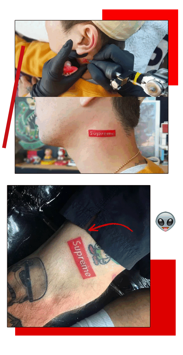 除了为它烧钱,Supreme粉还会狂热到,在身上留下Supreme logo的纹身,可能他们身上连父母或爱人的名字的纹身都没有,但却愿意给这个最爱的牌子留一个位置。