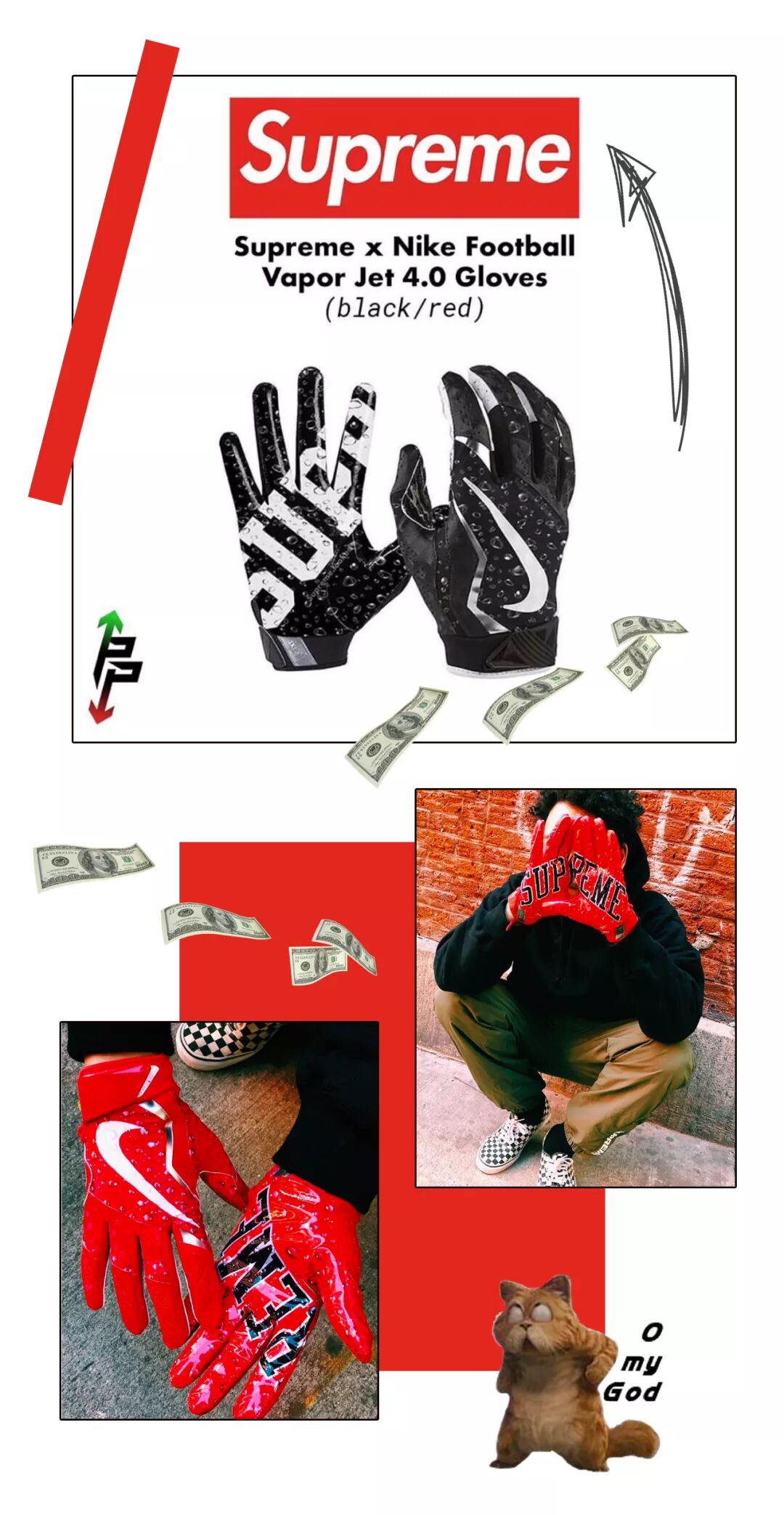 昨天NIKE发售的,与它家的联名款也是被一抢而空,然而那只是一款橄榄球手套,买它的人可能没几个会用到,但他们就是愿意为了它跟别人抢,因为它是Supreme