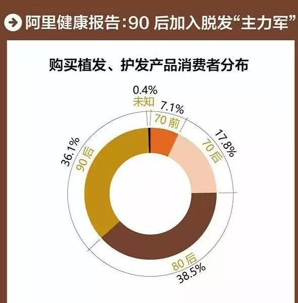 根据阿里健康联合阿里数据发布的《拯救脱发趣味白皮书》显示:在阿里零售平台购买植发、护发产品的消费者中,90后以36.1%的占比,即将赶超38.5%占比的80后,成为拥有脱发烦恼的主力军。