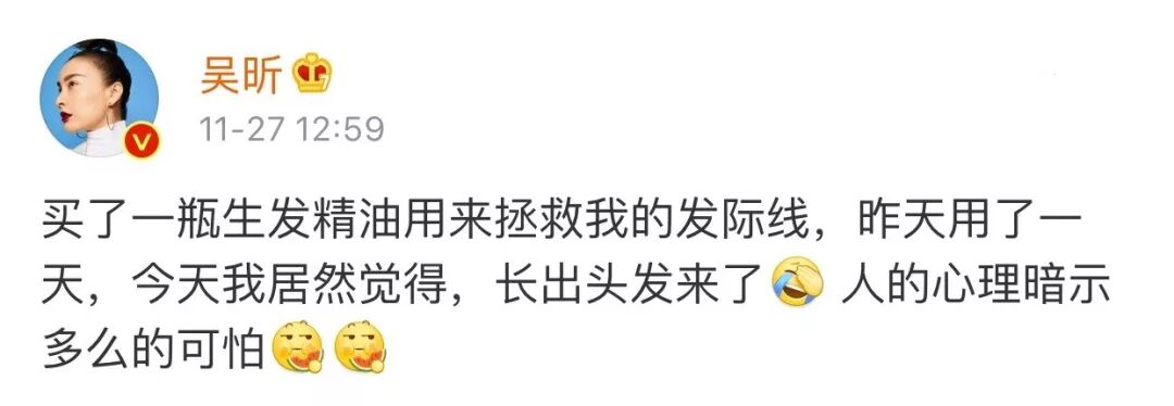 ▲吴昕就曾发布微博说她为了拯救发际线,开始使用生发精油。