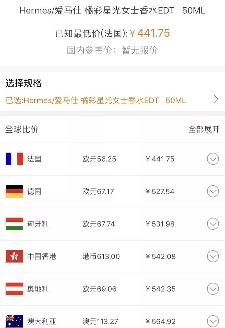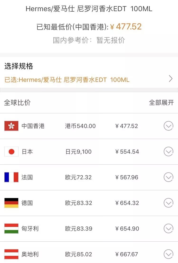 搞不清楚是50ML还是100ML的爱马仕香水,定价按50ML的算为620,全球范围内比价见右图。