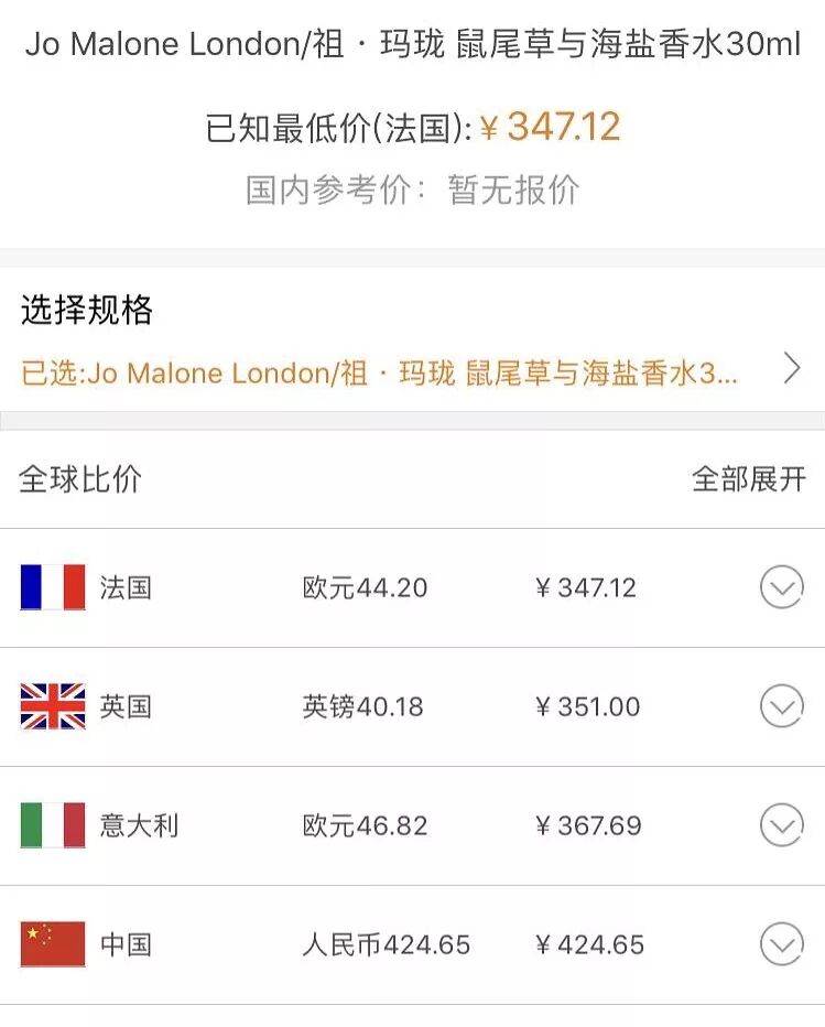 30ML的祖马龙香水,定价395,全球范围内比价见右图