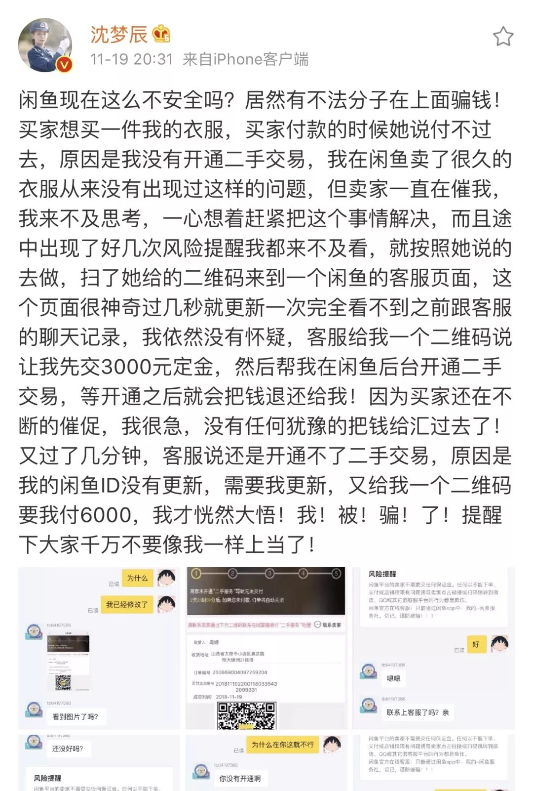 事情起源于11月19日沈梦辰在自己的微博上发布了一条信息表示自己在咸鱼上被骗了