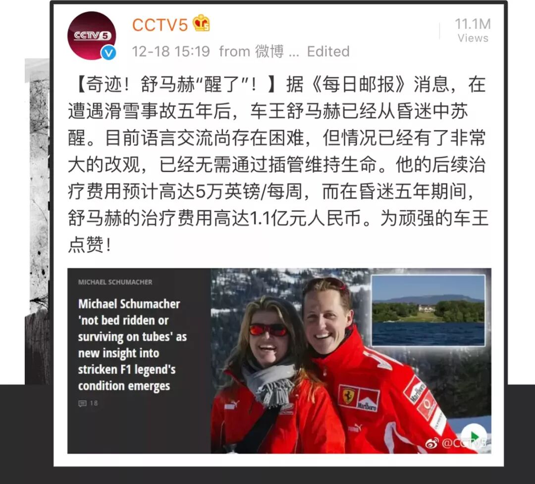 报道称,在遭遇滑雪事故五年后,一直卧床不起的车王舒马赫终于不再依靠插管维持生命了。随后国内的大V官媒也证实了这一消息,