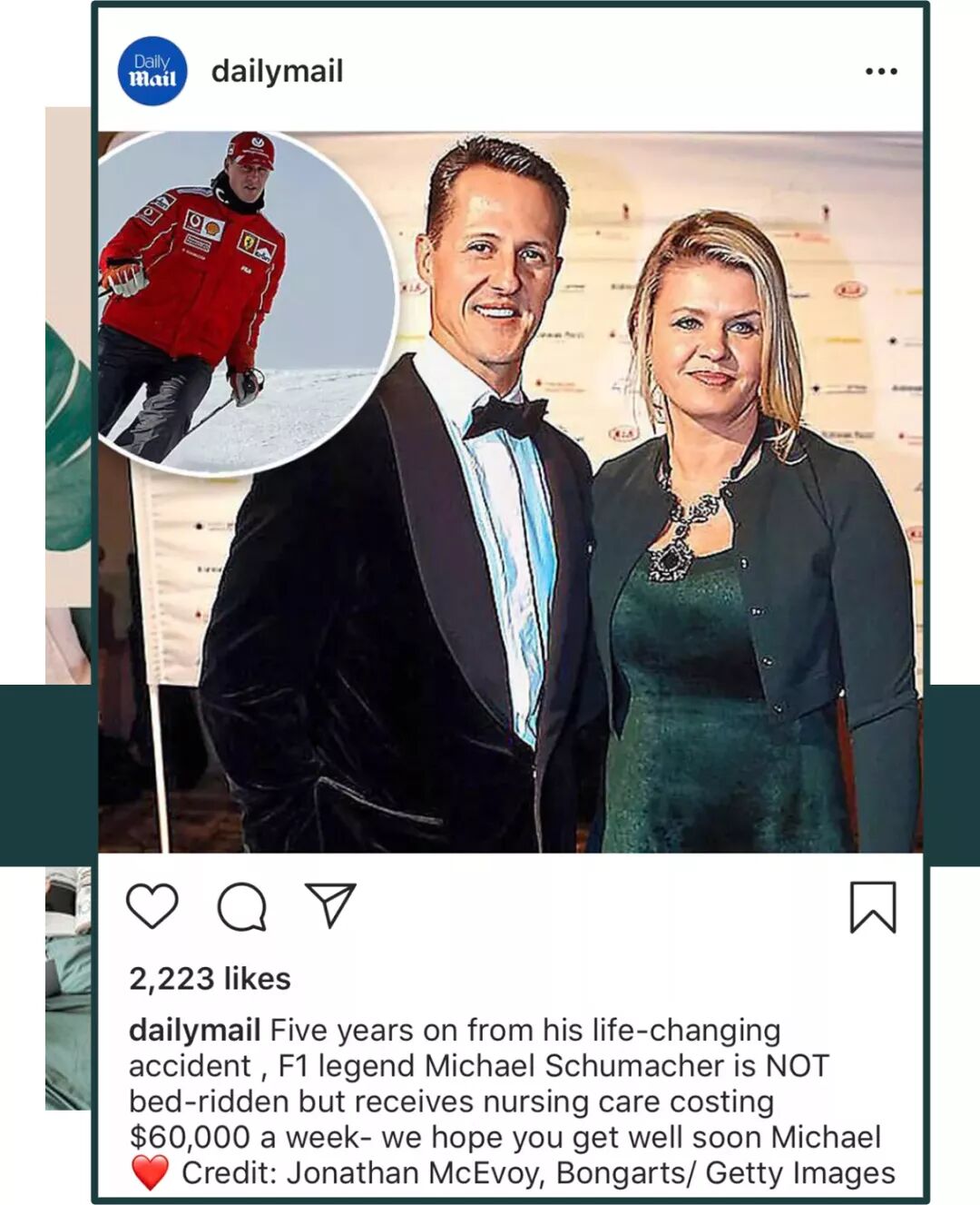 事故后,舒马赫经历了数次的脑部手术,修复期的治疗费用是每周10万英镑,也就是大概90万人民币。而为了舒马赫得到更好的治疗,科琳娜就在家里修建了全套的医疗设备,请了15人的康复小组对他进行全方位的照料。