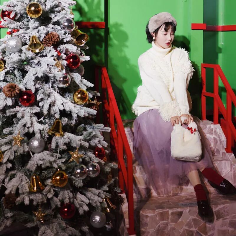 美丽说用户@Lihehehe:颐堤港圣诞小镇已经全面进入圣诞模式咯,穿仙仙的去拍照~白色有点特别设计感的毛衣有层次和渐变感的纱裙,搭配一条特别又暖和的毛发带,就很暖了。