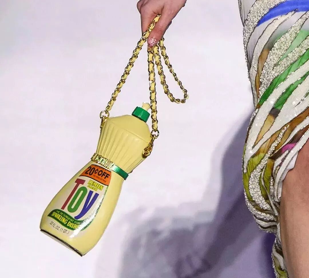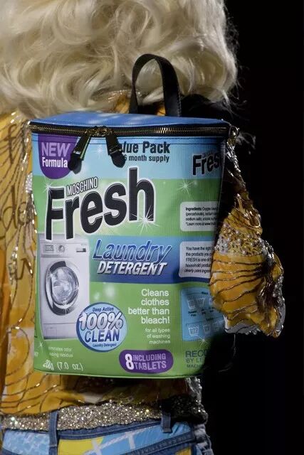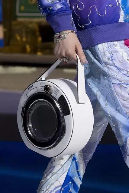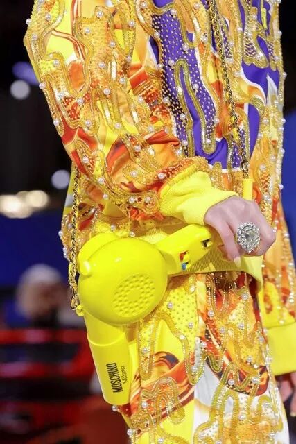 最吸引人眼球的恐怕就要数展示包包的环节了,设计师Jereme Scott延续品牌一贯是风格让模特们背的可全都是日用百货。牙膏、洗洁精、吹风机、熨斗……别不信,这真的很Moschino:怪异+趣味+没什么偶像包袱!!!