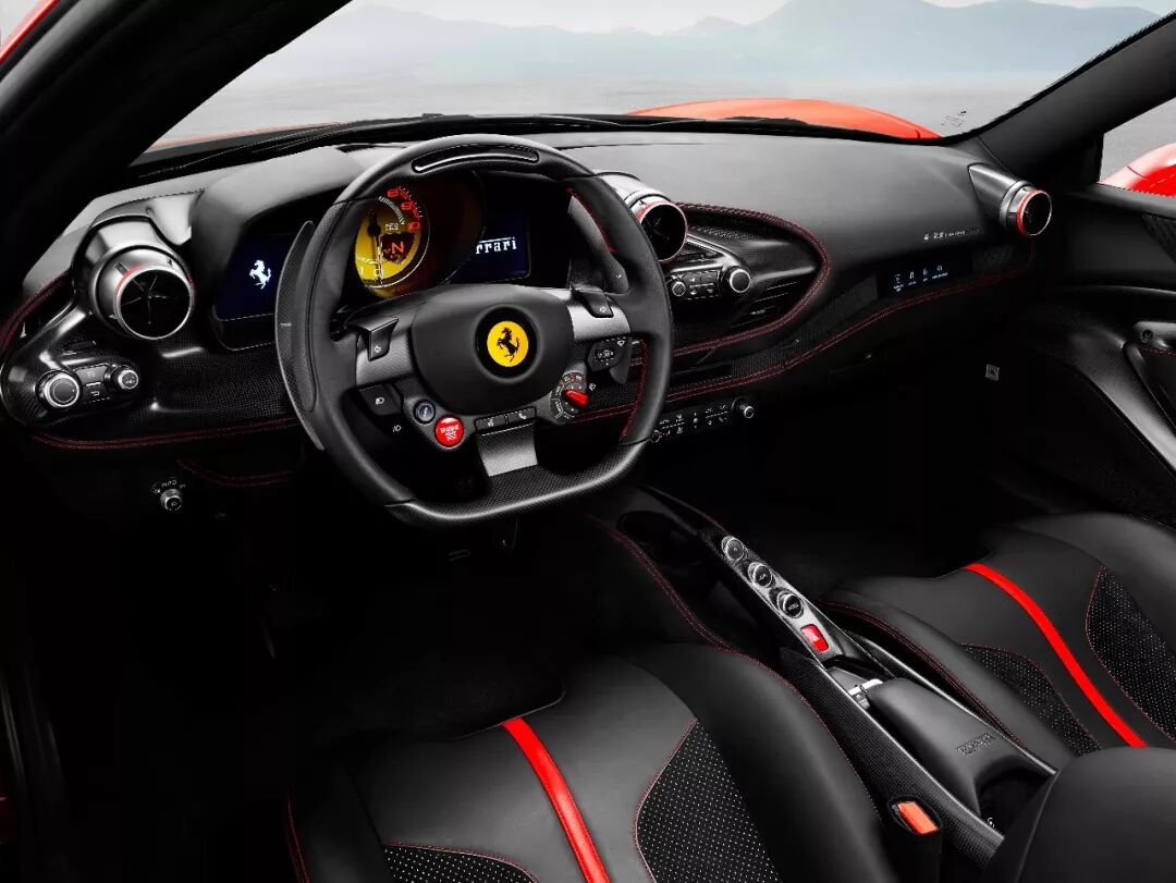 座舱设计以驾驶者为中心,Berlinetta经典的中后置发动机布局得以保留,同时对仪表盘、门板以及通道的各类元素则进行了重新设计。得益于全新一代HMI (人机交互界面)、圆形出风口、新型方向盘和控件以及新款7英寸乘客侧触摸屏的加持,F8 Tributo的驾乘环境得到显著提升。