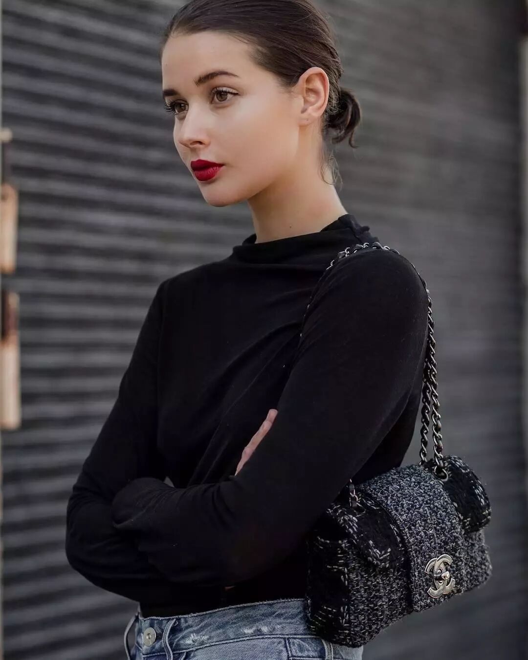 相反的偏爱深色着装的的小可爱,擦上大红唇,女王气场十足,同样给暗沉的着装添一抹亮色▼