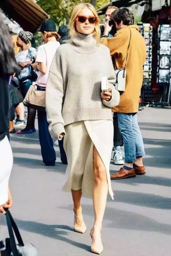 怕冷的小可爱们,别慌,oversize的毛衣之所以受到大众的追捧的秘诀在于:毛衣里面还可以再穿件贴身保暖内衣,搭配经久不衰的毛呢外套,既美丽又温暖▼