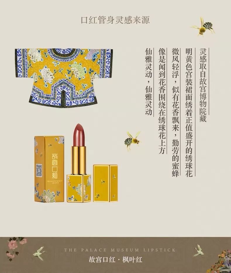 口红管身的灵感源自明黄色宫装裙面绣着正值盛开的绣球花,蜜蜂围绕在绣球上方,仙雅灵动。