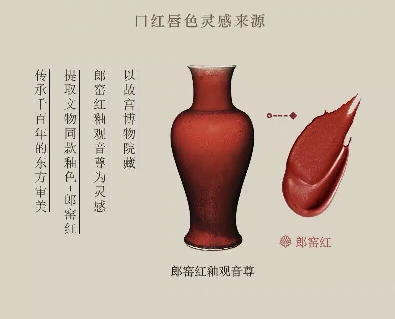 口红颜色灵感来源于珍藏文物郎窑红釉观音尊,饱和浓艳的红色尽显倾国倾城美色。