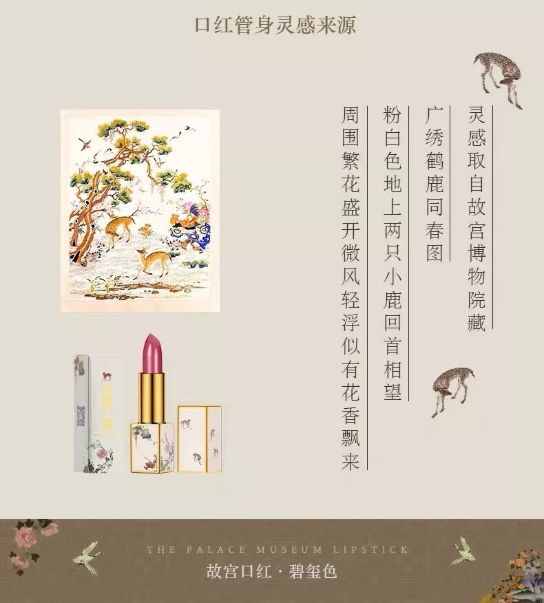 管身设计灵感来源于珍藏广绣鹤鹿同春图,粉白色地上两只小路回首相望,暗香浮动,灵动又童趣。