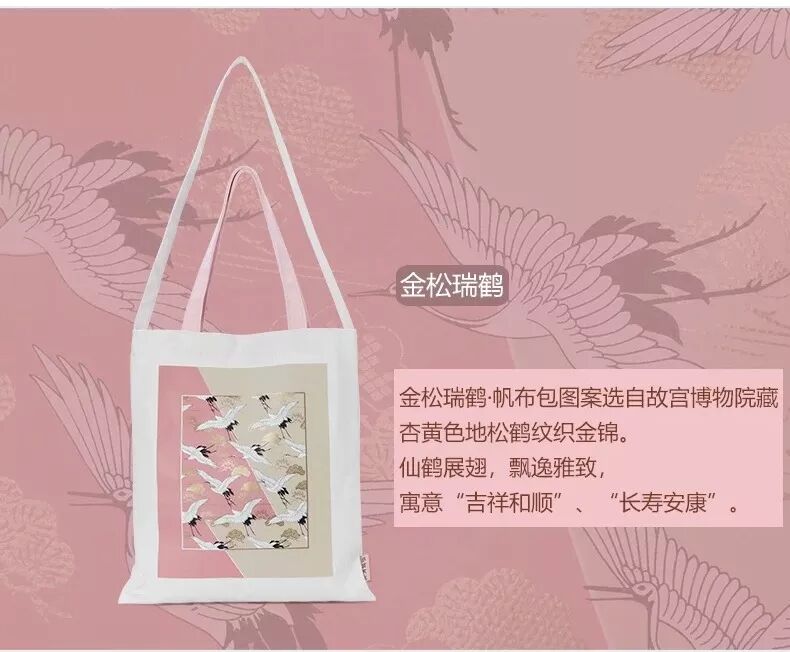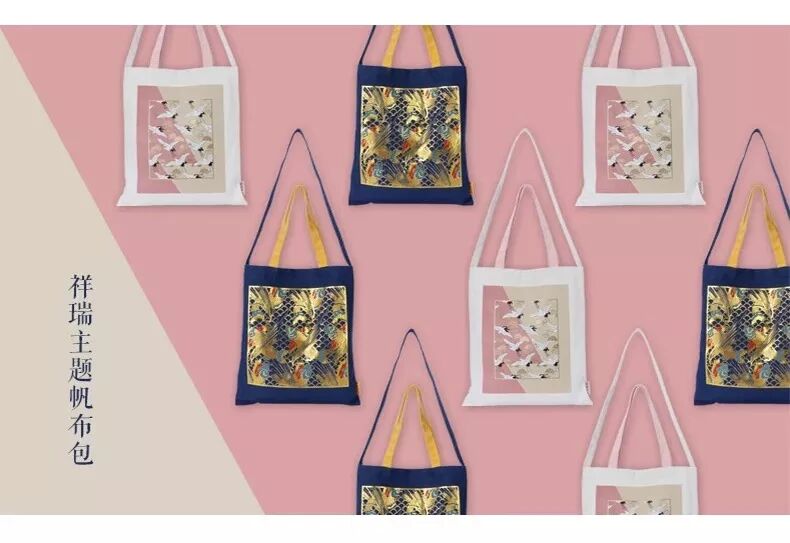 象征着祥瑞和顺的帆布包,图样取自【杏黄色地松鹤纹织金锦】和【印彩鲤鱼海水纹布】。