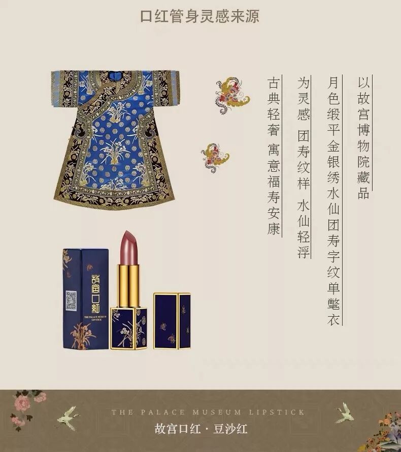 而口红外观的图样灵感来源于珍藏的洋红色缎绣百花文夹氅衣,百花与仙鹤交相呼应,尽显古典之美。
