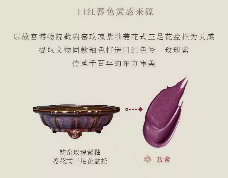 唇色灵感源自故宫博物院藏钧窑玫瑰紫釉菱花式三足花盆托,薄涂减龄厚涂气场夺目,超级显白提气场。