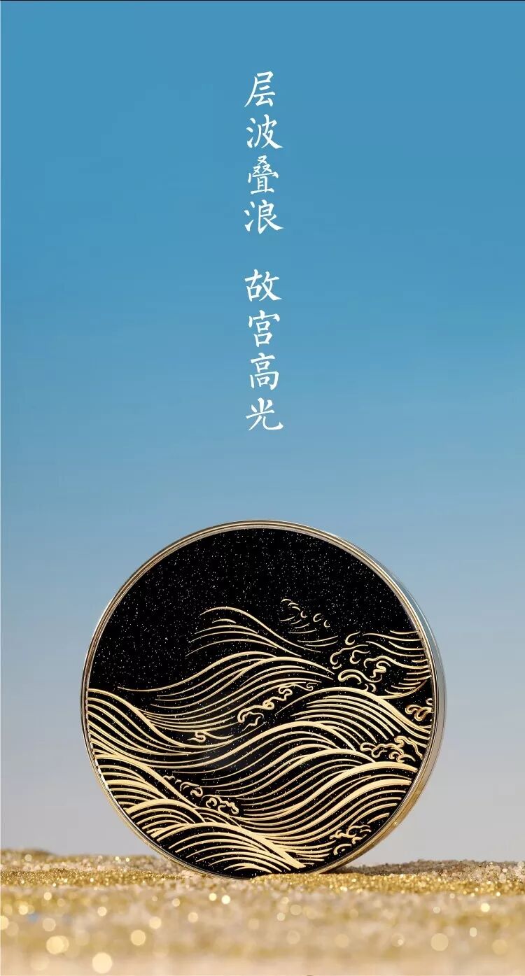 层波叠浪高光,外壳的图纹源于珍藏文物水图卷,里面的高光也是分为三层的波浪形状,可以用于局部提亮和美白。