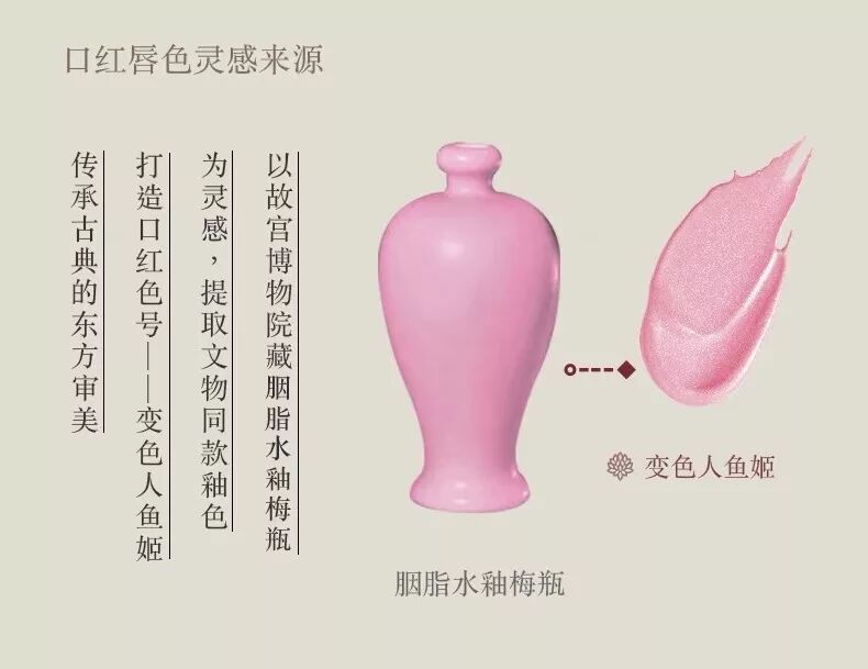 唇色灵感源于胭脂水釉梅瓶,粉嫩俏皮清新活泼很适合白皮妹子,少女心必备。