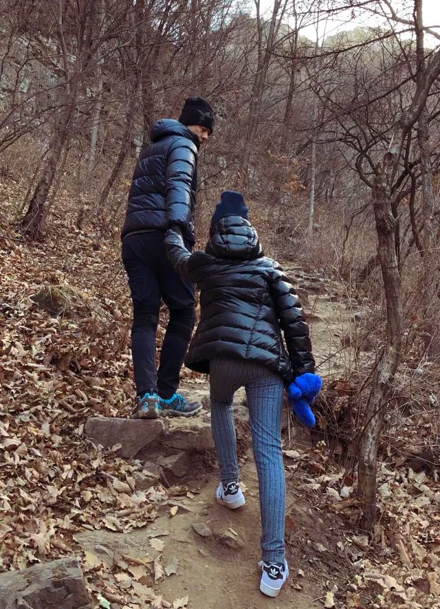 他也爱带着她去各种户外活动,培养她与大自然的情感。像爬山: