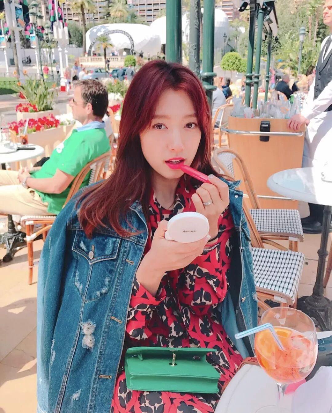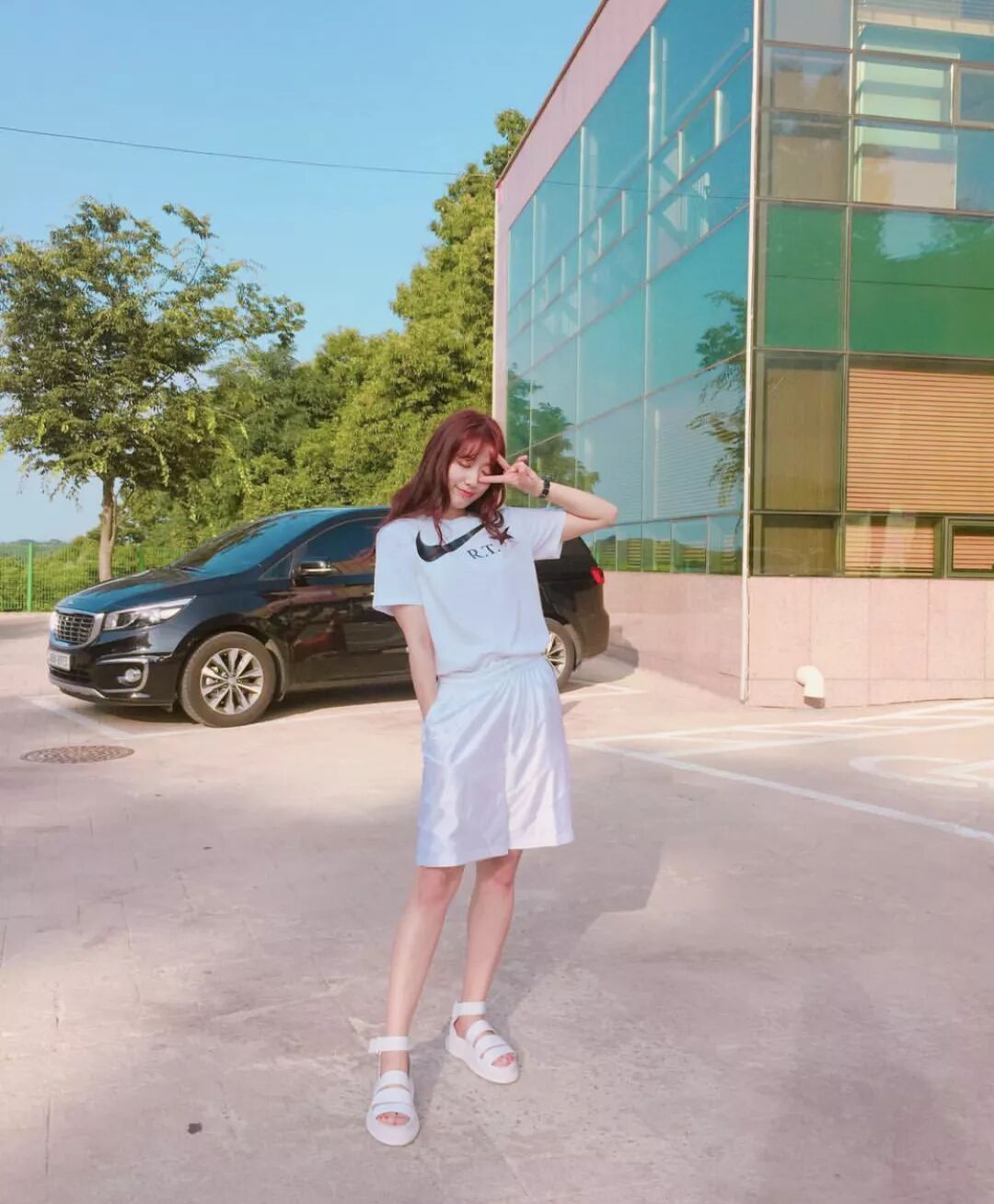 除了偏休闲风的韩系穿搭,女神当然也有少女心爆棚的时候,一些小女生的甜美元素在朴信惠的私服中也是相当常见的~