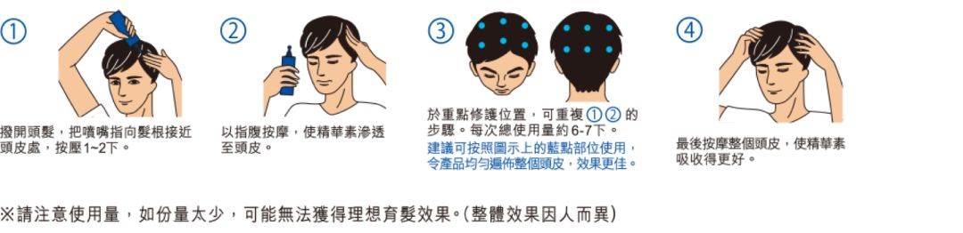 在头顶均匀点涂6到7处,然后顺着头发生长的方向按摩推过去,重复操作直到需要使用的头皮都已经覆盖到为止,早晚一次即可。