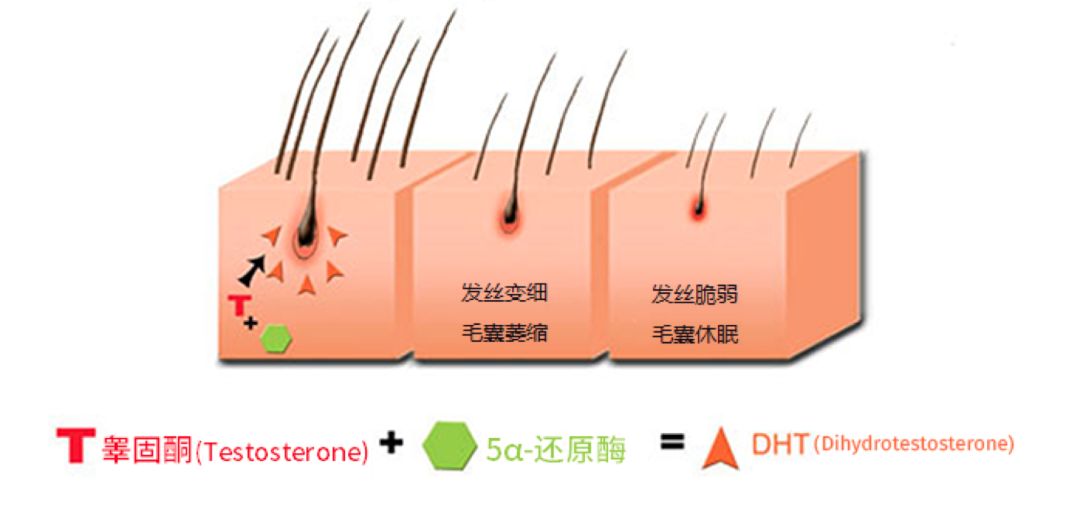 毛囊会在DHT的持续刺激性攻击下不断萎缩来抵御伤害,头发因此得不到充足的营养而脆化脱落,最终毛囊闭合,不再产生新发。