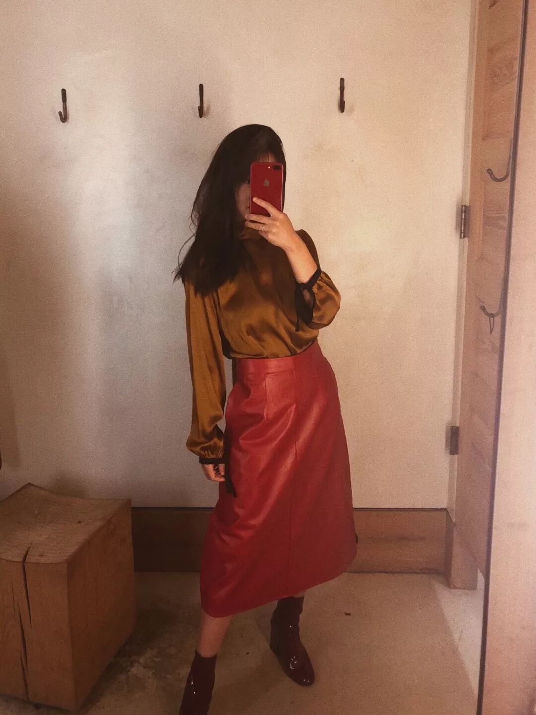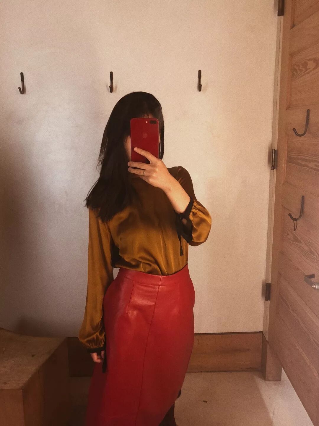 下装搭配了一件红色皮质半裙,这件版型是过膝的A字裙,裙型很优雅又显高,手感非常细腻没想到竟然不是真皮,这里要插一句大部分美国品牌注重环保,为了保护小动物已很少使用真皮草了,而且环保皮草的工艺也很高级,值得提倡。