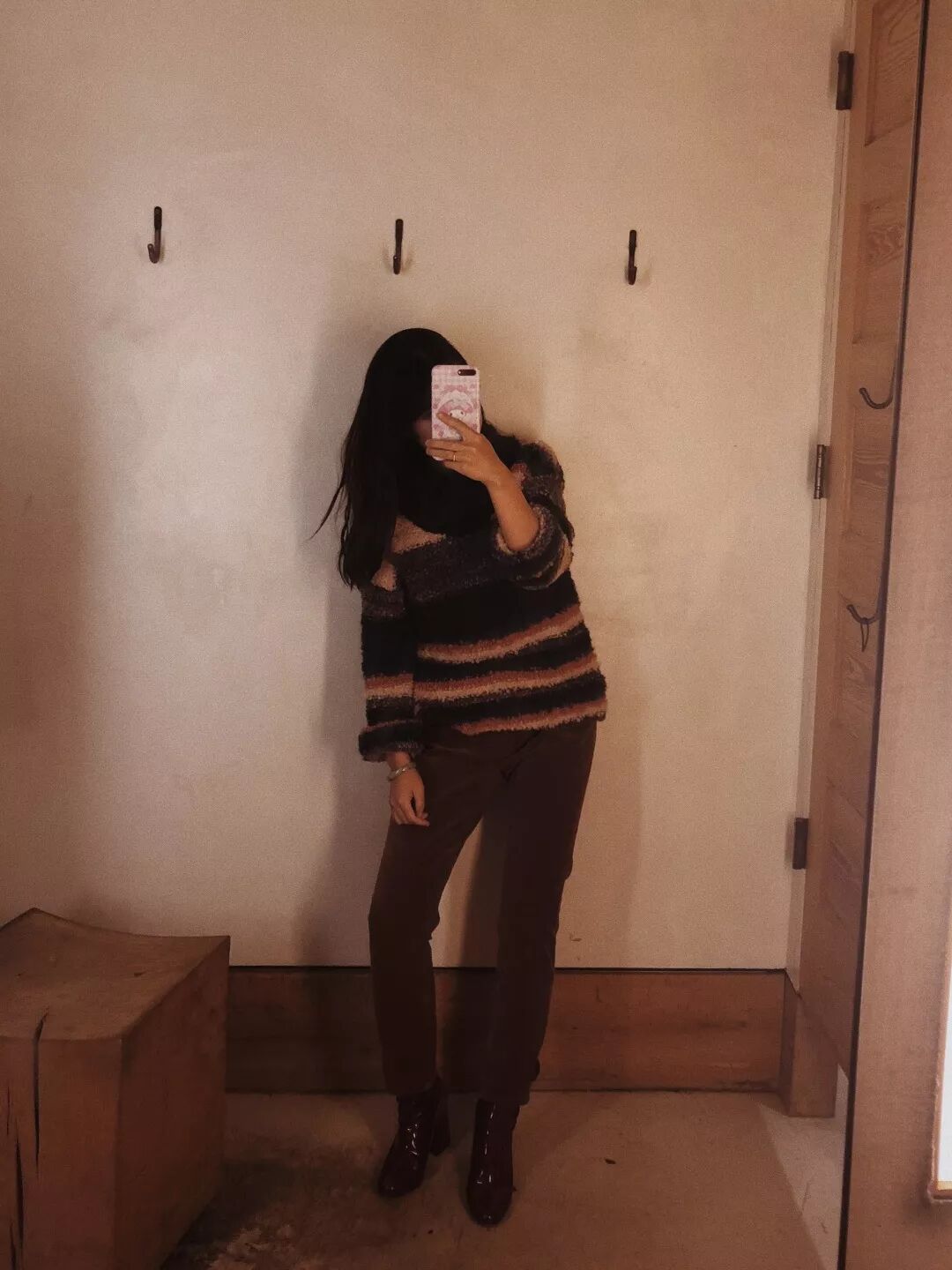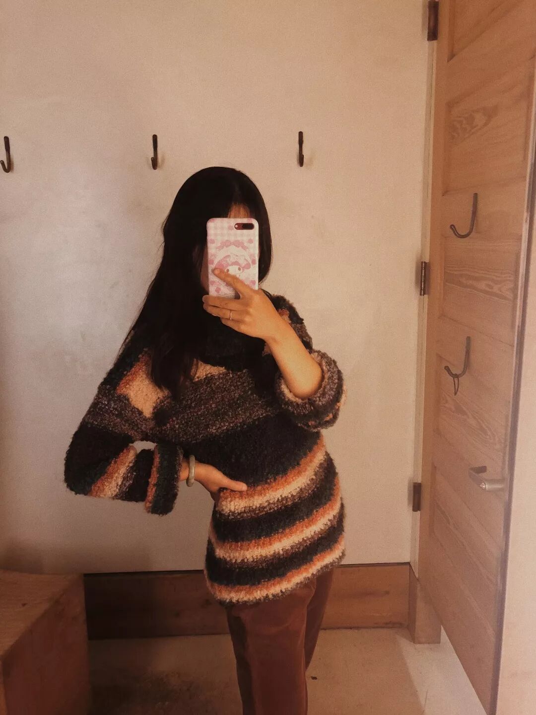 这件毛衣的配色超级有节日氛围,毛茸茸的很可爱。一般这种质地的毛衣会有点显胖,这件很惊喜的是竟然完全不显胖!盆领的设计让脖子看起来很袖长,袖口有一点小水袖的意思,所以整体很轻盈飘逸。