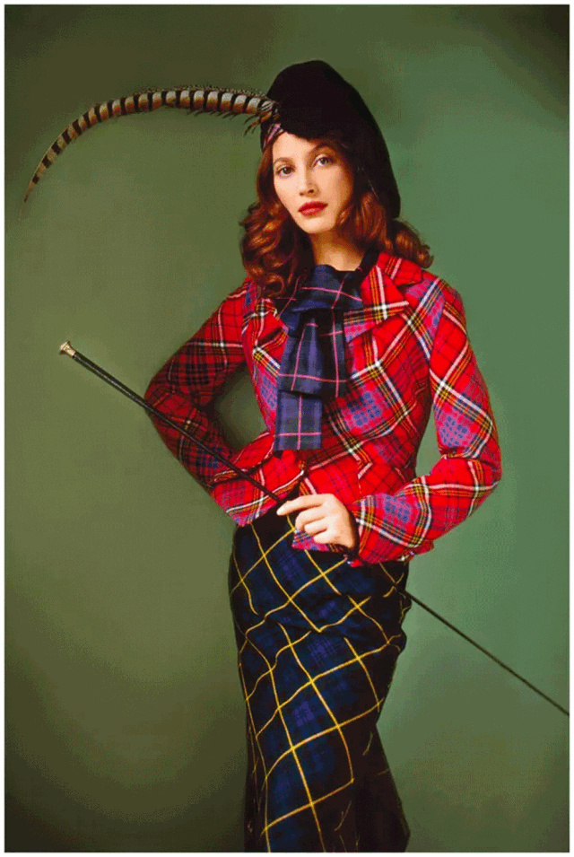 好了言归正传,除了上面的T之外,Vivenne Westwood & Burberry 此次的合作系列,都是跟“格子”有关。这个从Kate Moss、Claudia Lavender等人的演绎中就能看出。Kate Moss身上的那件丝质衬衫也是有个有趣大的三角领设计细节。