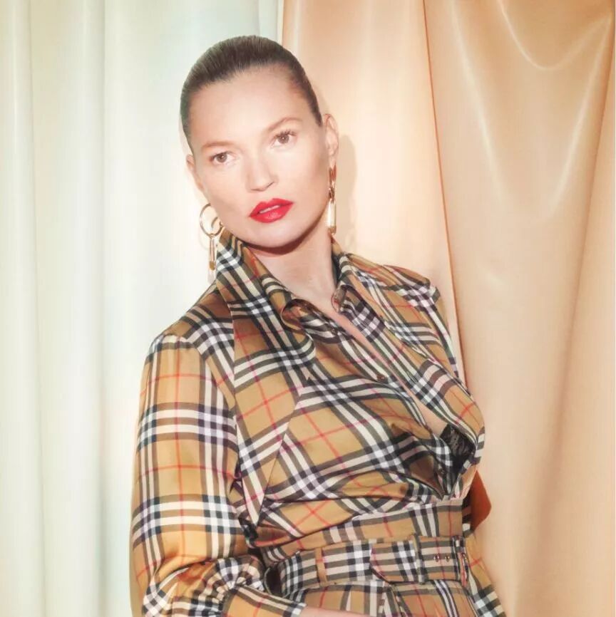 比如请来了Kate Moss出山,来上身 Vintage 格纹丝质衬衫。▼