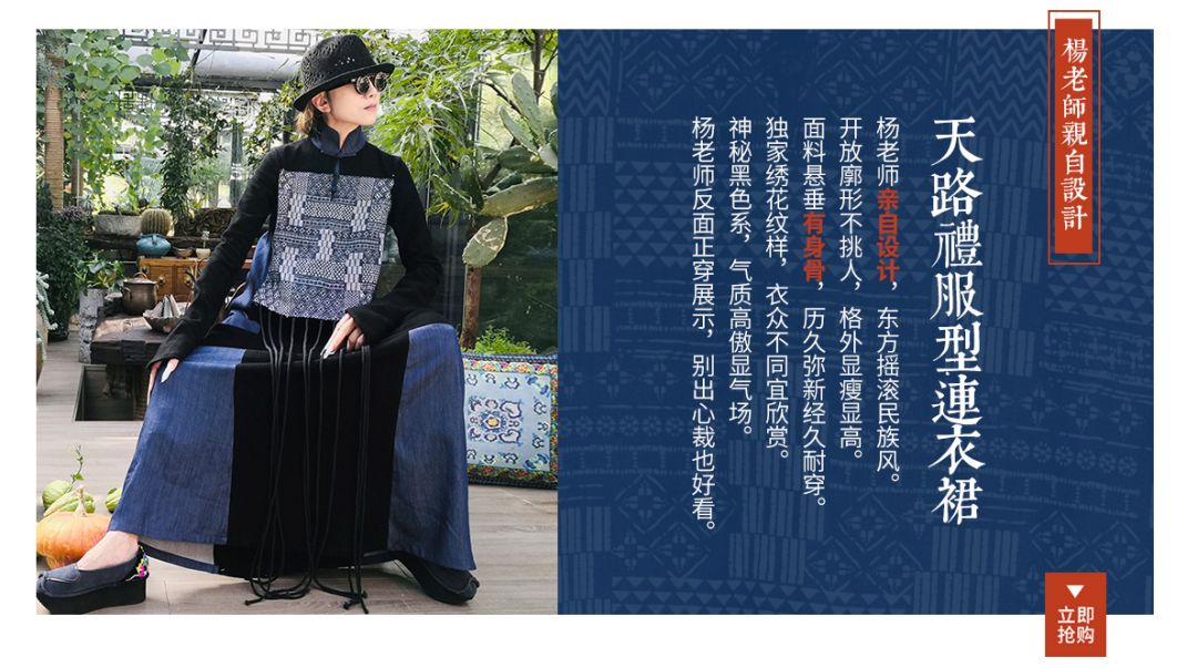 色彩强烈的民族风服装搭配和眼花缭乱的民族风配饰,经纬间恰似还有些许现代时装元素,可以说杨丽萍设计的中式服装,浓缩了中华五千年民族的历史与文化,代表了民族的传统与个性。