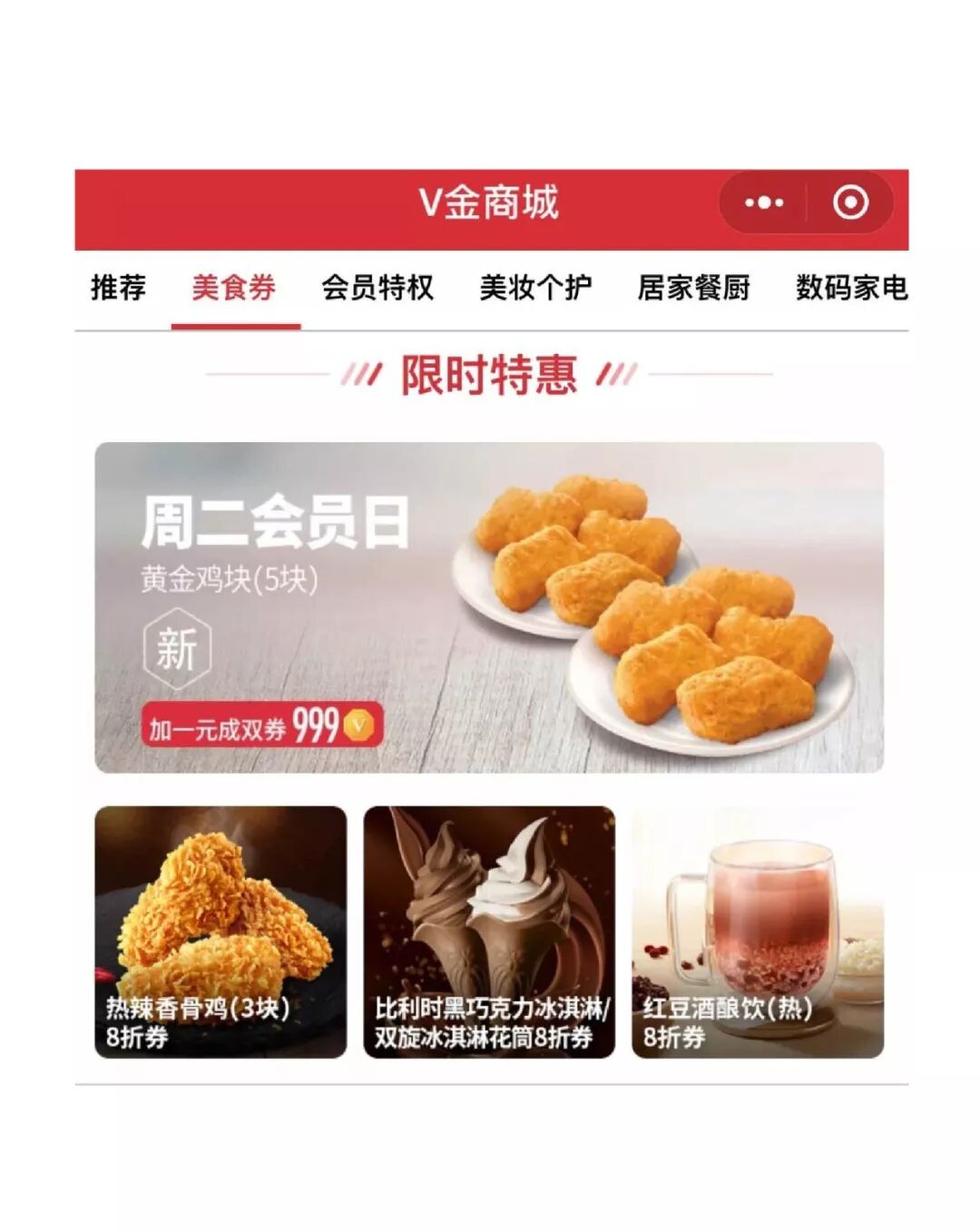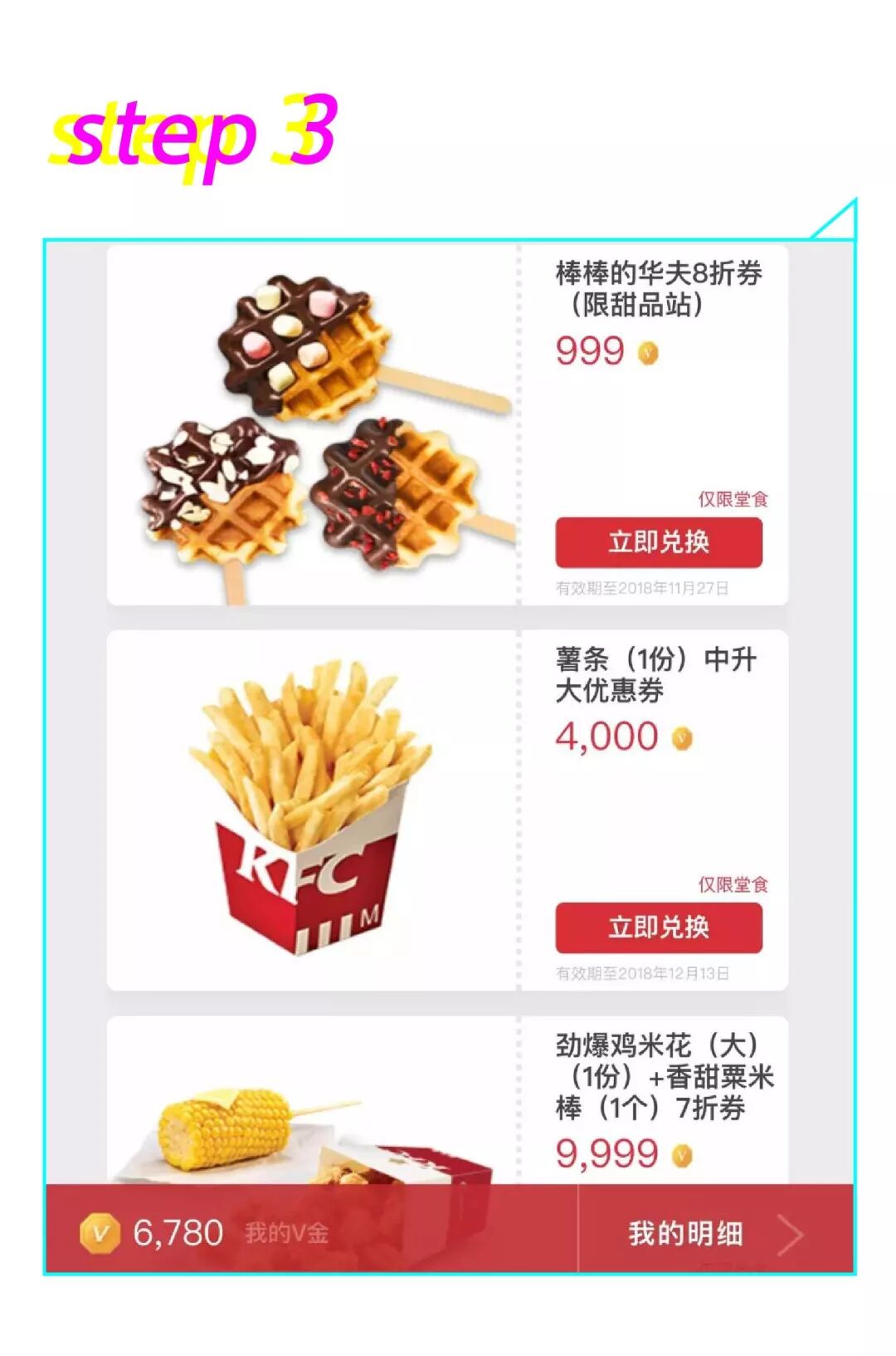 签到得V金和肯德基卖品免费券。连续签到7天就可以得到一张冰淇淋的免费券,同时还得到一定数量的V金,免费卖品券过一段时间就会更新,每次不一样的,这周我记得是蛋挞。