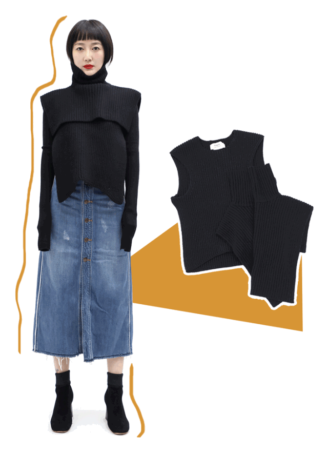 虽说买君这件是无袖设计,但其实它特别实用。里层的长款是圆领设计,单穿在里面加一件高领打底就是一件妥妥的“毛线马甲”;外层的短款是高领设计,内里换一件圆领打底又是一个全新的look