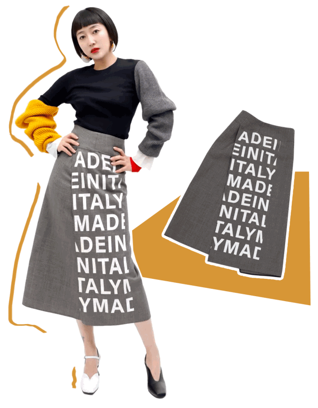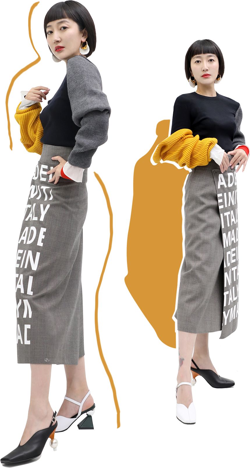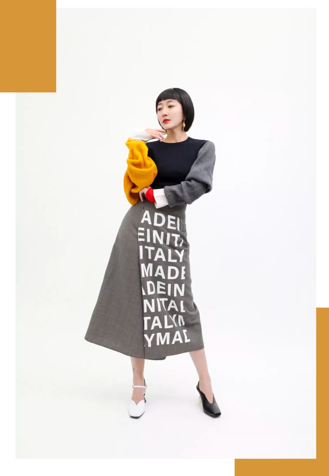看上去它是纯灰色的,其实它的灰色部分是由细细密密的灰格纹“组建”起来的。因为有字母在裙身做点缀,原本性冷淡的灰色看起来也雀跃不少,所以买君挑了件色彩明快的针织衫和它做混搭