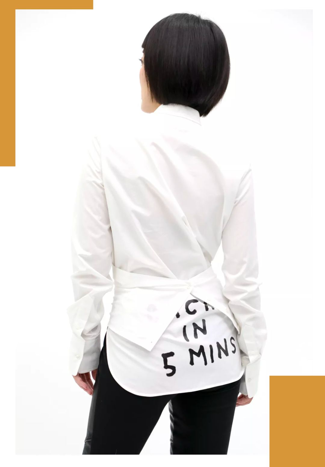 这件衬衫采用前短后长的结构,在衬衫的两侧加入了可环绕的薄片,背部还有字母涂鸦
