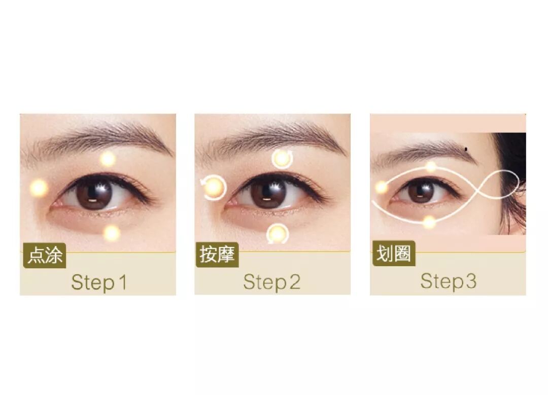 课代表划重点啦:按摩手法简单,先把大眼眼霜涂在眼头、眼中、眼底位置,再拿着原谅棒在这三个位置的打圈按摩,最后再顺着眼周打圈画8字。通过点线面精准按摩穴位,促进血液循环,加强有效成分的吸收。