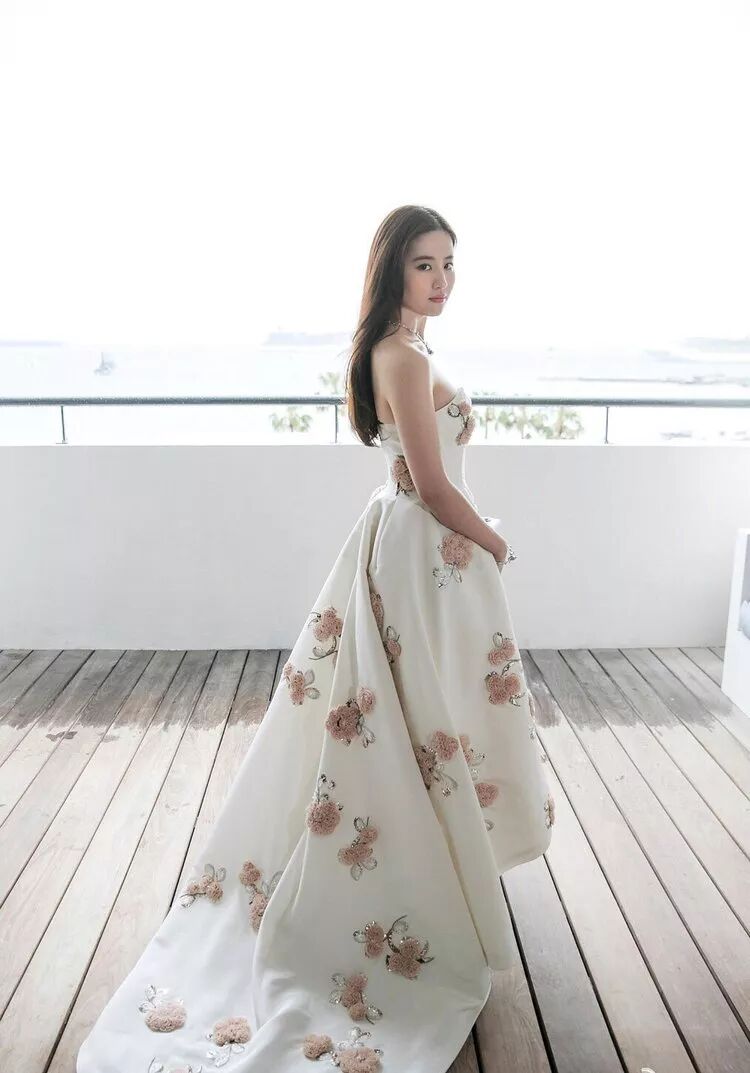 裙子的颜色也越来越“干净”了。这件白色礼服裙只点缀了一种颜色的花朵,高级又好看。