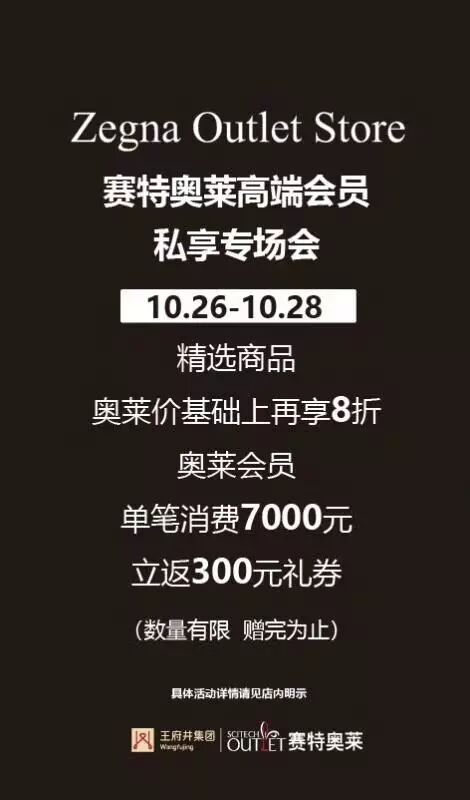 - 赛特奥莱高端会员私享专场会2018.10.26-10.28 精选商品奥莱价基础上再享8折,奥莱会员单笔消费7