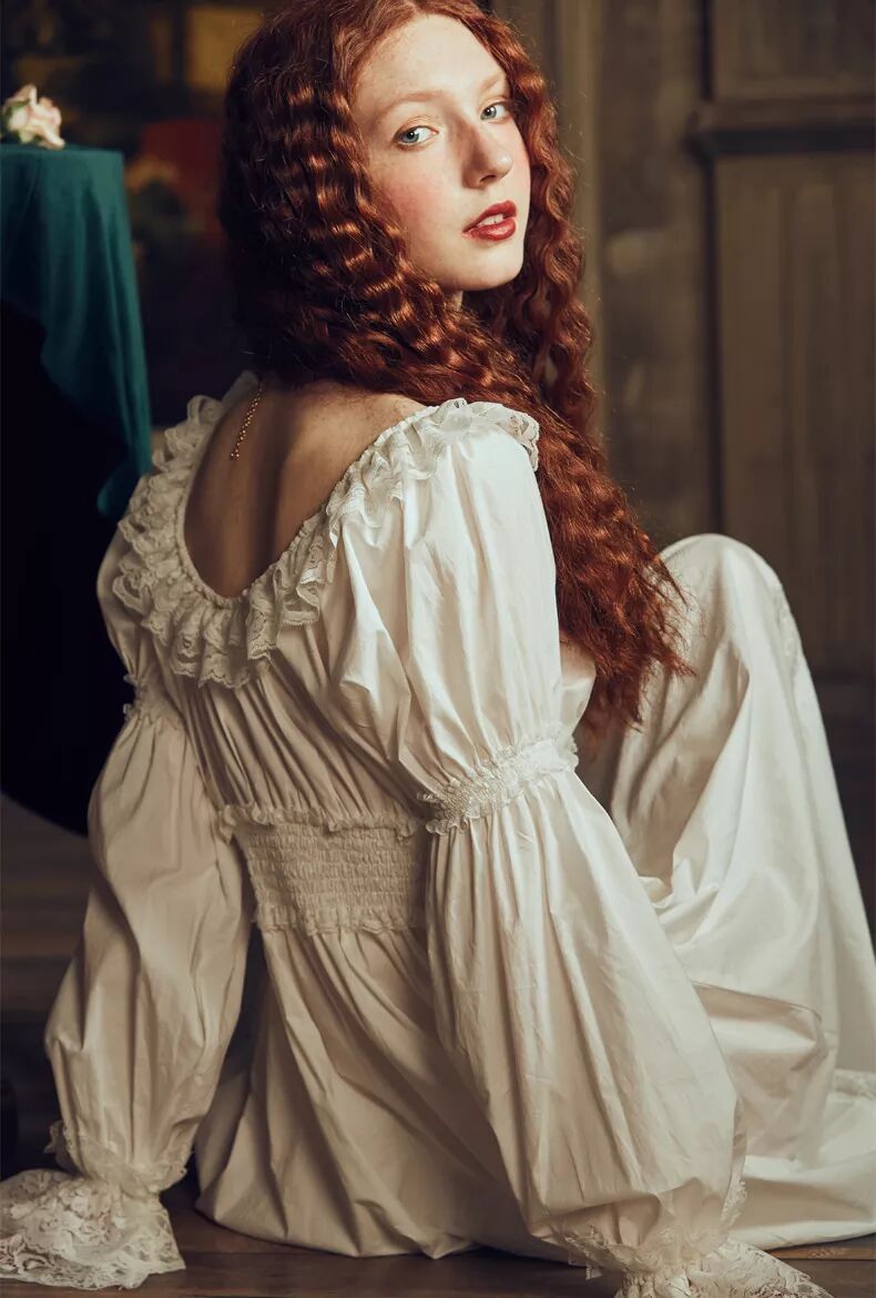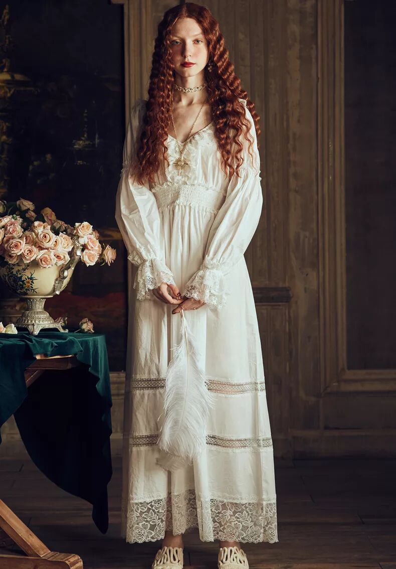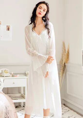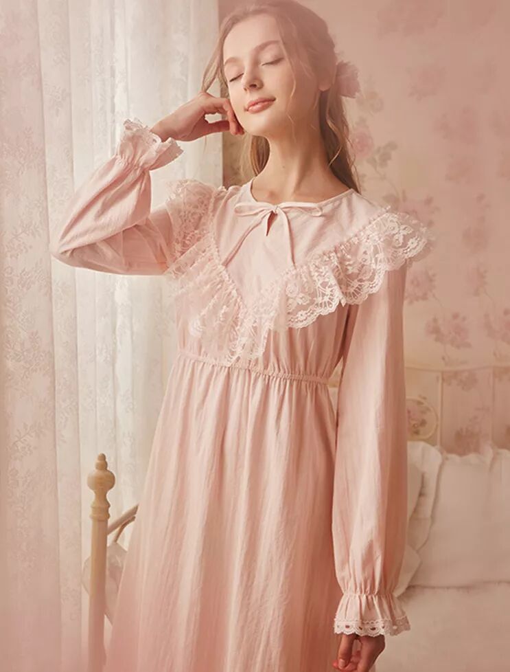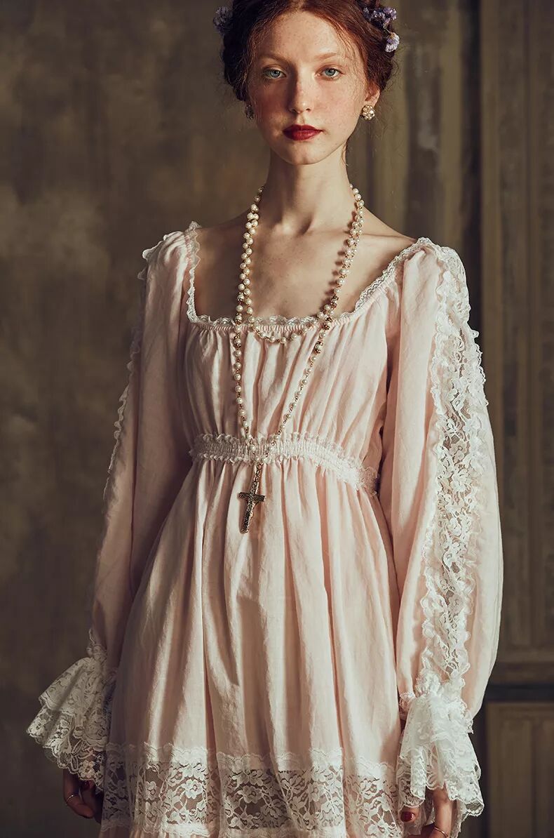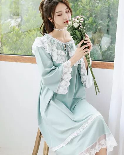 荷叶边、蕾丝装饰、过膝甚至到脚腕的长度都是宫廷风睡裙的标配,不论是白色、淡粉、淡蓝还是淡紫色都很是美好。