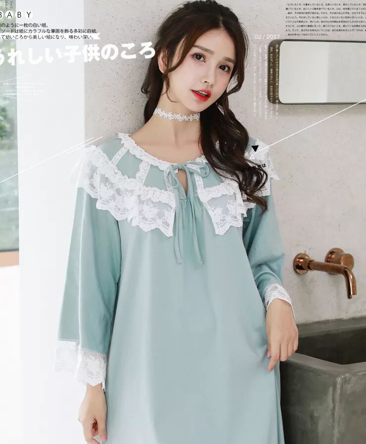 说实话我一眼就被这条睡裙的蓝绿色吸引力哈哈。宫廷睡裙里,这种清新又浓重一点的颜色确实比较少,仿佛自带滤镜一样,炒鸡显白!