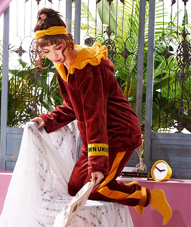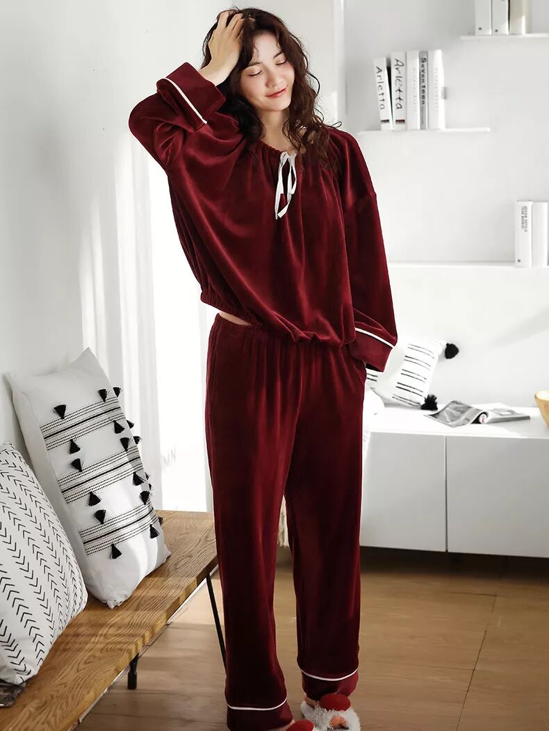 酒红色珊瑚绒厚家居服套装