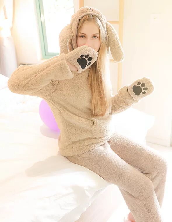 加厚兔子耳朵珊瑚绒保暖套装