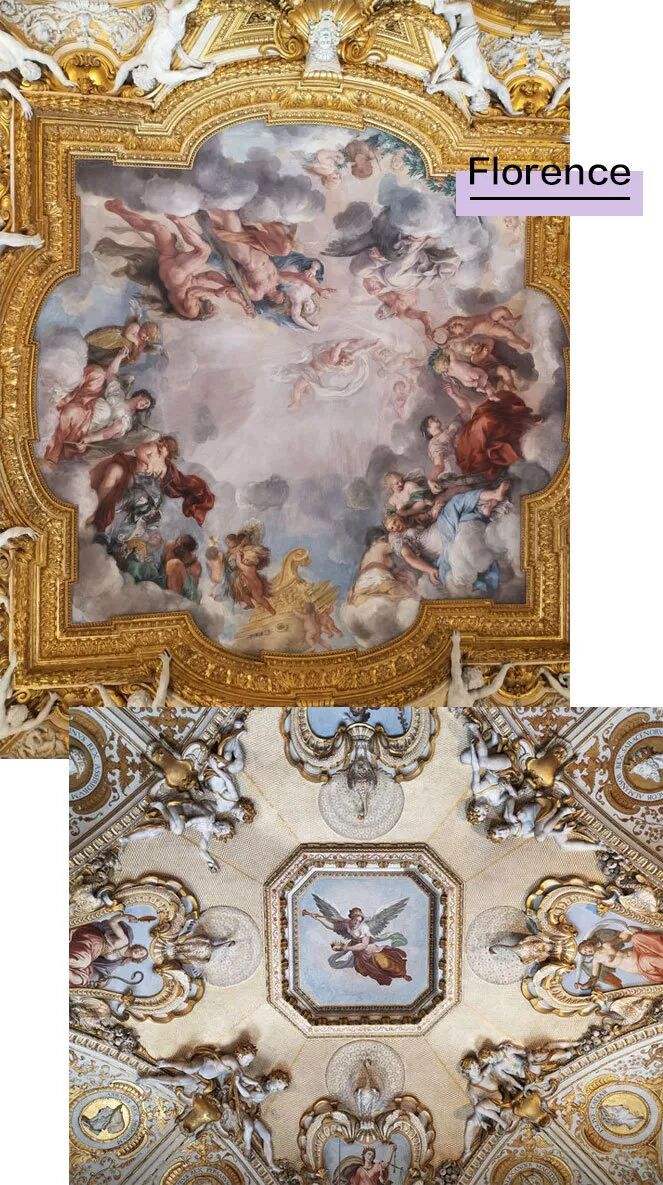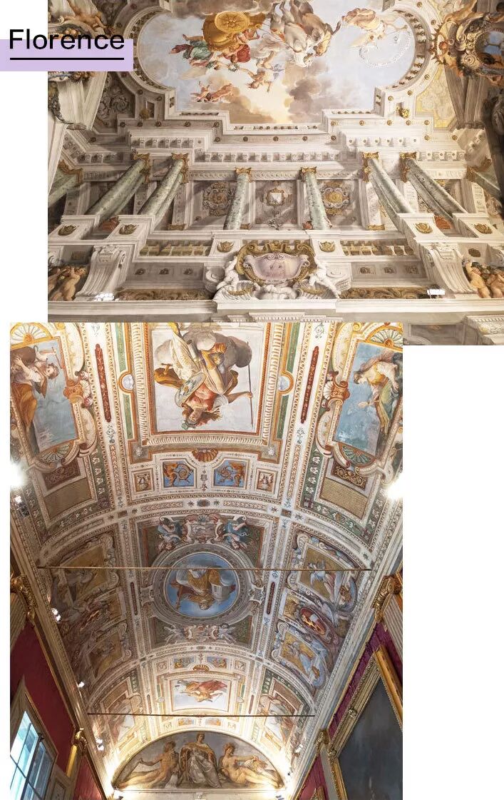 艺术家在穹顶绘制出来的如同雕塑般的立体视觉感,全部都是画出来的。这些绘于16世纪中叶的壁画作为美第奇家族留存于世的艺术珍宝,保留在皮蒂宫中。为了看清上面的细节,我特意用手机把图像放大,不得不说,前后主摄拥有1200万双像素的美图T9手机确实比其它手机清晰度好太多,不过为了拍到它们我的脖子都要断了哈哈。