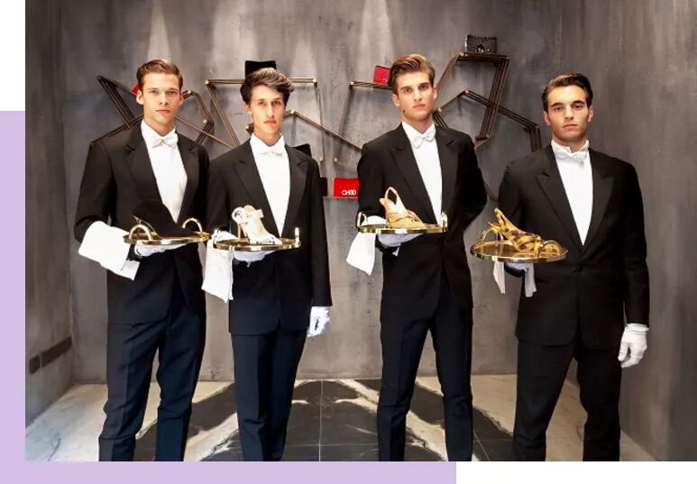 而且我记得那天的甜点特别好吃,一不小心连续吃了三块小蛋糕。那天最亮的其实并不是鞋,而是站在入口处、端着JIMMY CHOO新款迎宾的鲜肉们,左数第3位小哥哥有没有!!一同前往的编辑部小姐姐没忍住上前合了两张影哈哈。