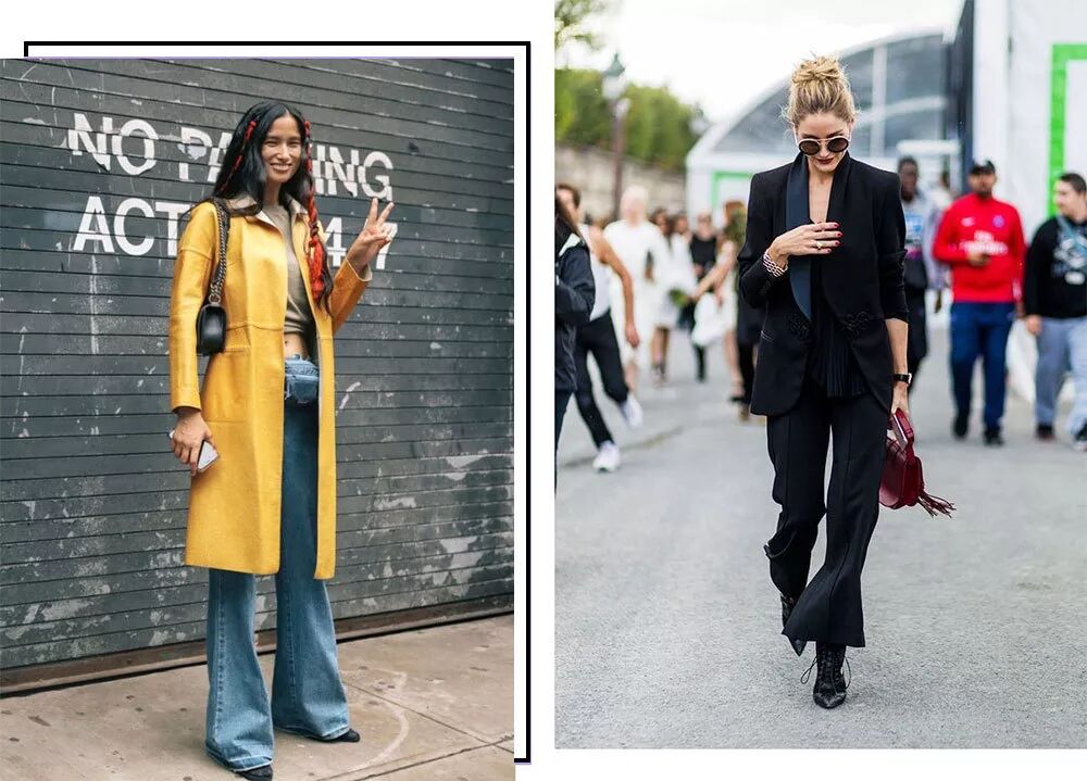 不过相对于原始的那种上紧下松的款式,目前来说,整体宽松式的阔腿喇叭裤更受大家欢迎~