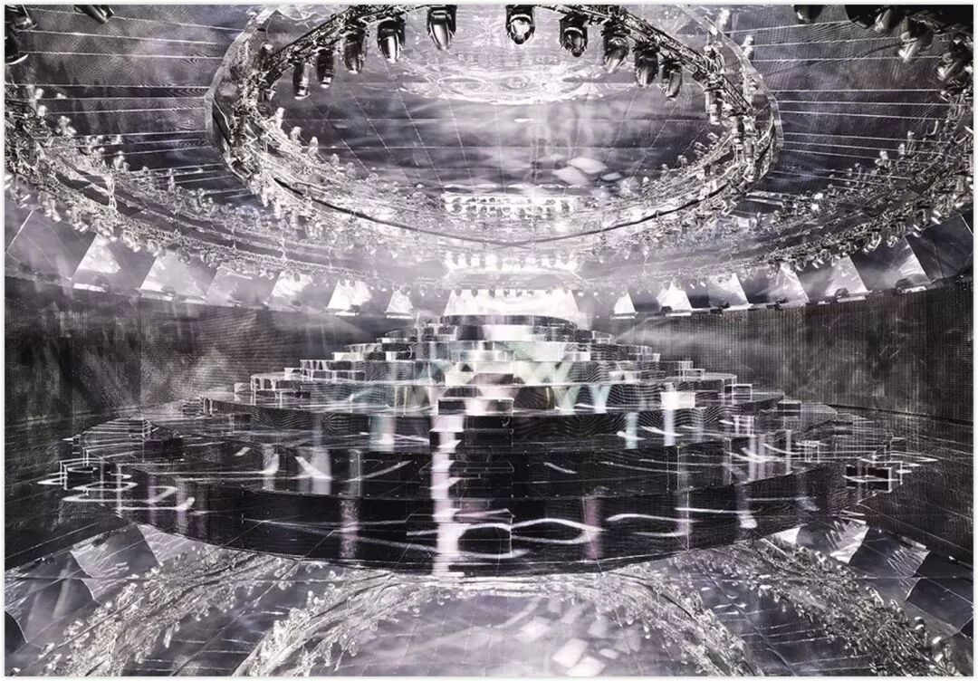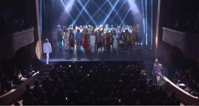 据说这次用了超过12万只LED灯才打造出这个像万花筒一样的巨幅墙面,超过百米的T台全是镜面组成,是史上最bling bling的runway没错了![]()