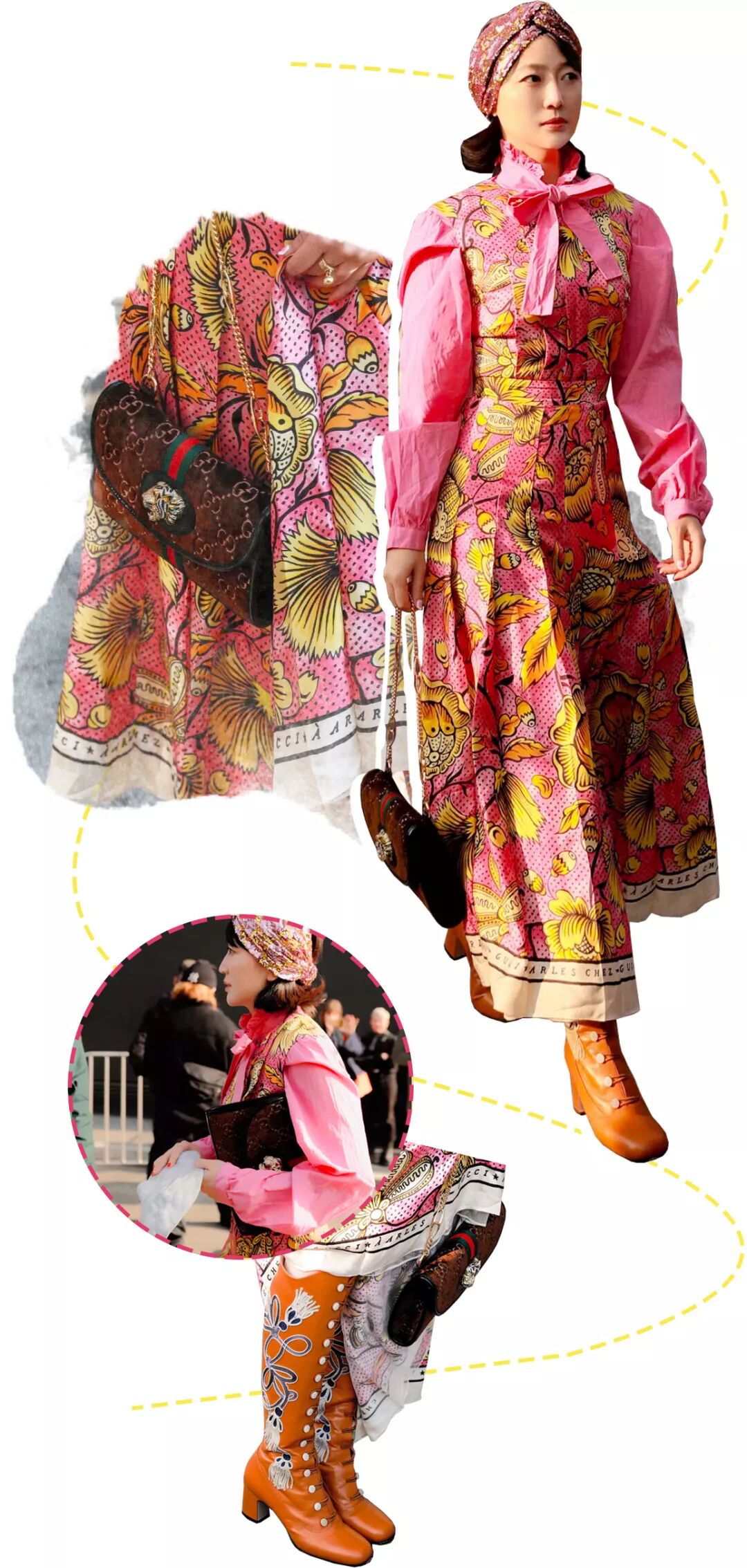 色彩浓重的头巾、带着宫廷气息的羊腿裙和改良版的刺绣罗马战靴,还有极为复古的丝绒老花WOC,嗯,怎么说呢,好像还真有点像油画里走出来的古希腊女神nei~